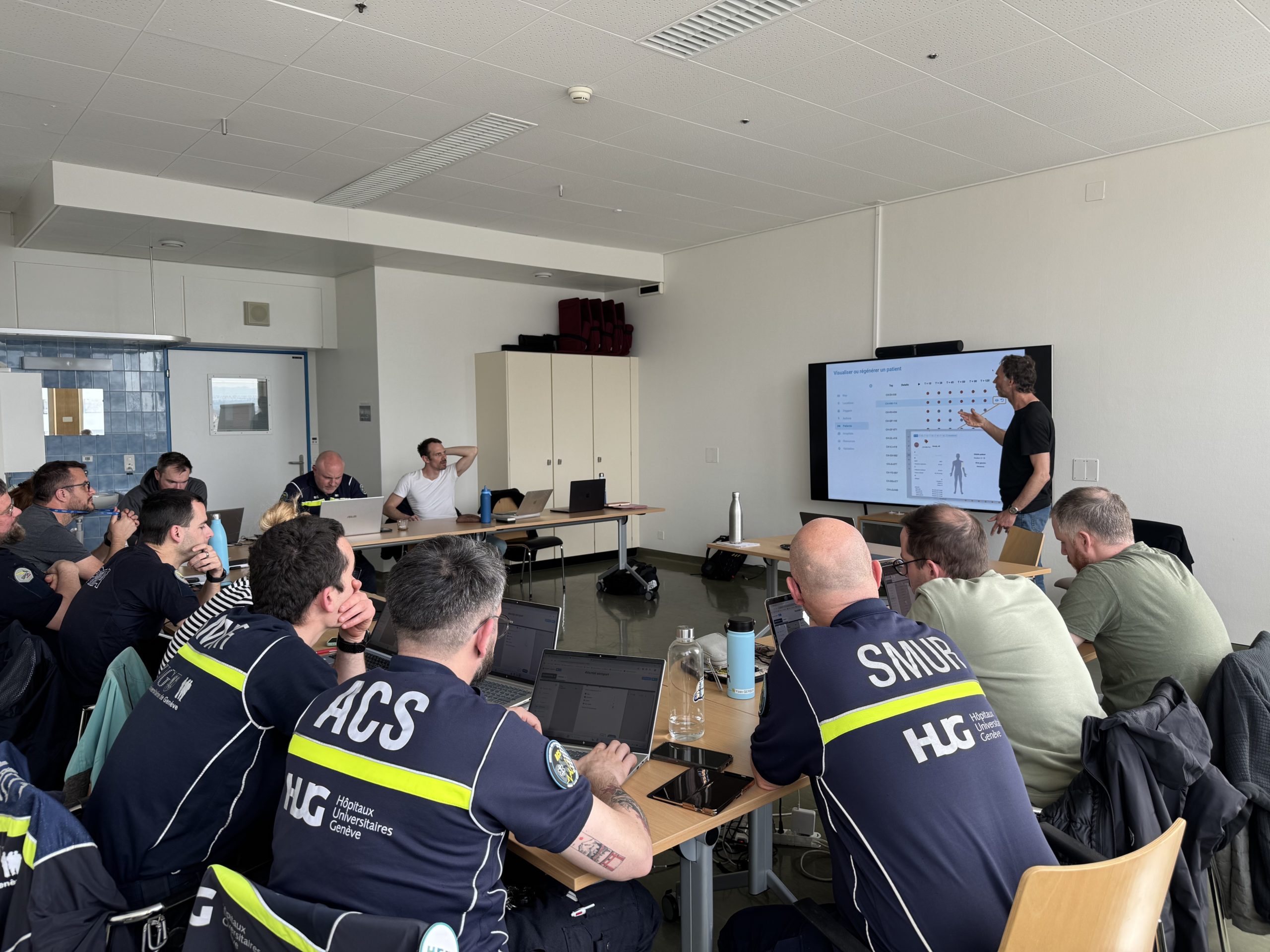 Lors de la journée technique Romande (JTR) des postes médicaux avancés, Xavier Good (Albasim) et Eric Golay (HUG) ont animé un atelier basé sur notre simulation de pré-tri des blessés, qui a rencontré un vif succès. Tout au long de la matinée, cinq sessions ont réuni dix groupes de participants venus d’horizons variés — médecins, infirmiers, sage-femmes ambulanciers et secouristes — pour découvrir et tester la simulation du pré-triage.